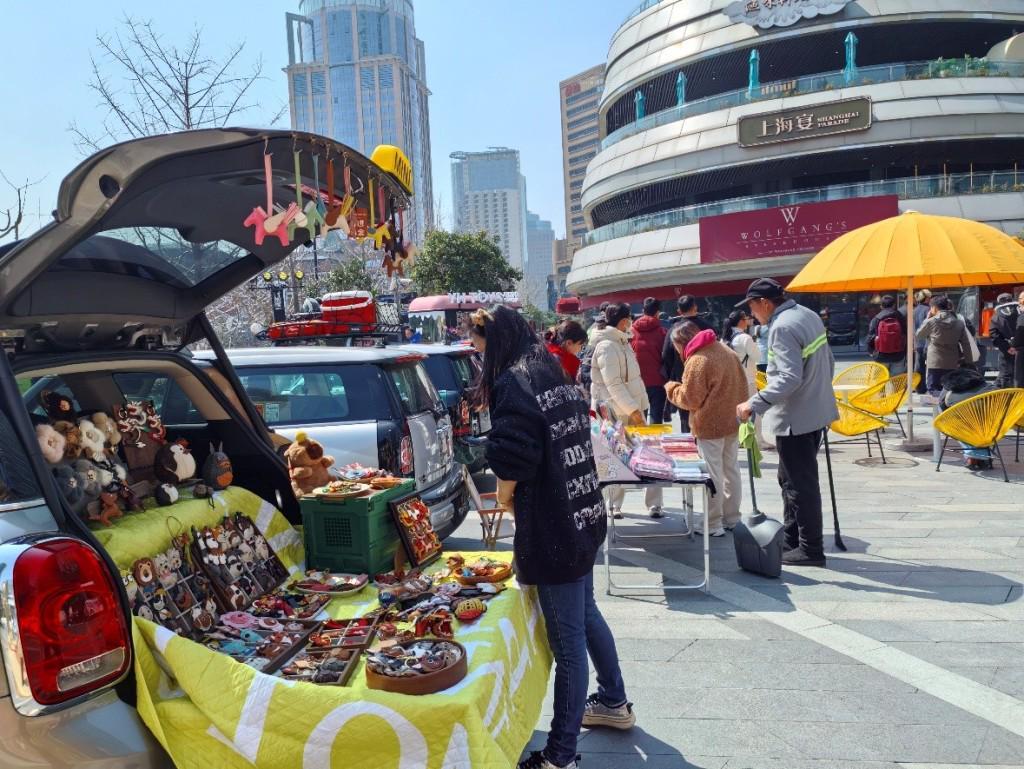 3月13日13点左右,白玉兰广场上的主题市集,部分内容与赛车、竞技等并无关系,但价位和产品本身(公仔、手工艺等)比较契合普通购物需求。