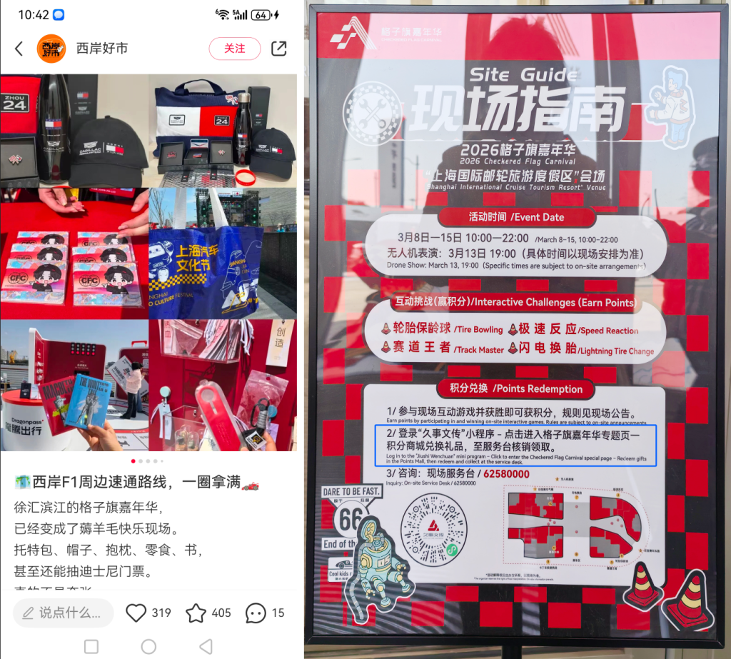 此次文创快闪店或市集参与到活动中,对前期聚集人气,拉长消费时空的作用显著。百元之内的零售小纪念品(非品牌赞助类)和快时尚小百货(未来可以有F1品牌赞助方参与)都是常见业态。但北外滩“反应”太晚,宝山的兑换机制复杂,相较而言徐汇西岸的做法更优,值得推广。而且在活动结束后,快闪店还可以根据天气情况,尝试运营时间向后再拉长1周左右(参考南京东路“一百”的F1主题零售期向后延长至19日),有可能在滨江分会场起到明显的长尾效应。